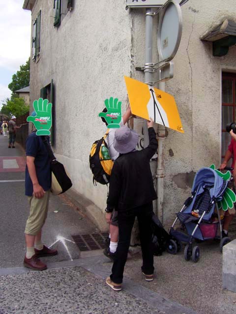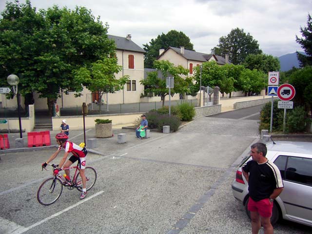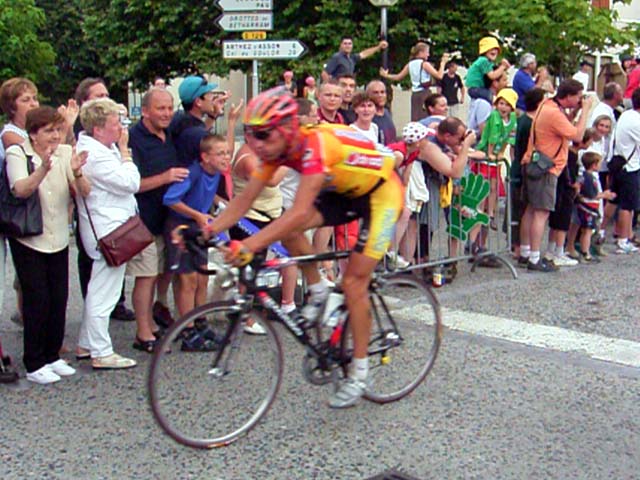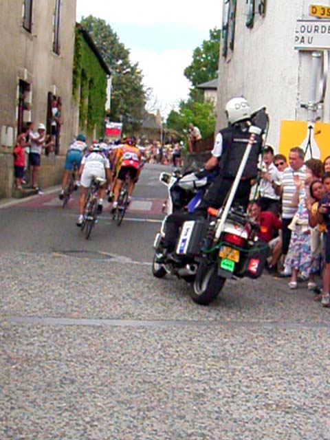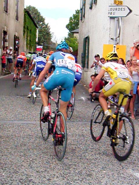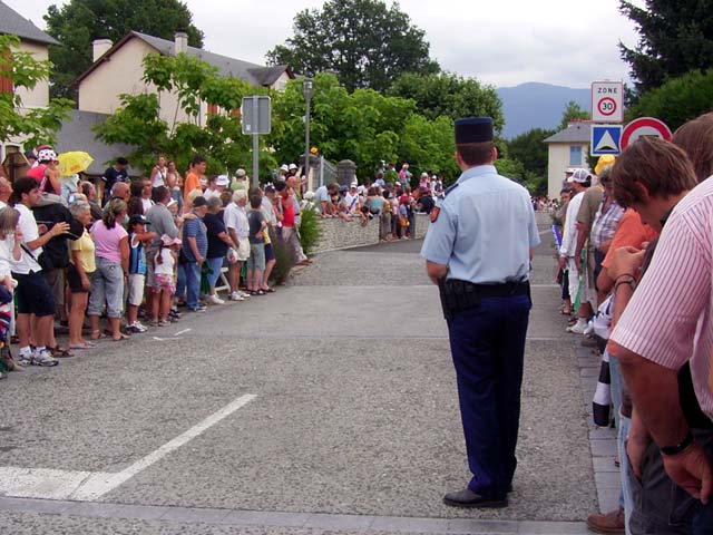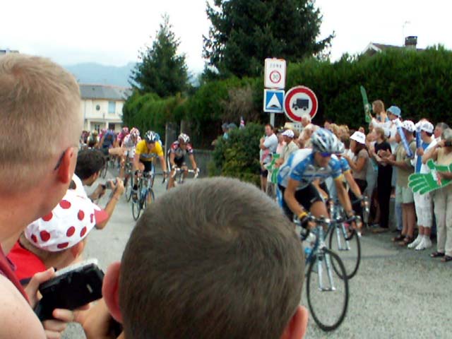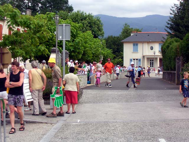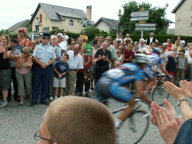 そのとき観戦することになったのは、Assonの街。ちょっとした市街地で、2〜3階建てほどの石造りの建物が、狭い道を挟んで並んでいます。人ごみも結構なもので、コースの両側には観客の壁がすでに4重5重にできています。もうキャラバンは通った後らしく、みんなキャラバンが撒いていったグッズを身につけたり手に持っているのでした。 既に観戦ポイントを吟味するほどの余裕はなかったものの、私がどうにかもぐりこめた場所はちょうどゆるいカーブのインコースで、選手がやってくるのも走り去るのも良く見える位置です。もちろん良く見えるとはいっても前に障害物があると見えないわけで、背の低い私は、人の壁の薄いところを選びつつ前のほうにジワジワ移動し、なんとか最前列までたどり着きました。ダンナはいつの間にかコースを渡って、コースの反対側で人垣にまぎれています。ぬかりなくカーブのアウトコース側を確保した模様です。