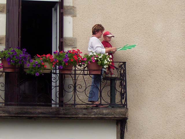 2階のバルコニーで選手が来るのをまっている親子。フランスで見かけた民家のバルコニーは、どこも花がいっぱいでした
