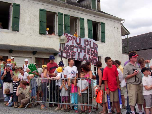 偶然立ち寄ることになった、Assonの街。キャラバングッズを持った観客で、コース際は大賑わいです。コース際の建物からも、ツール歓迎の垂れ幕が……と思いきや、「BONJOUR NORTHERN IRELAND」の文字。んん?北アイルランド??