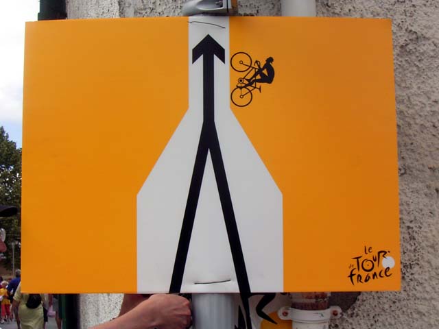 ツールに出場している選手に向けた道路標識。「この先、幅員減少」のサインです。プラスチック製のダンボールのような軽くて丈夫な素材でできています