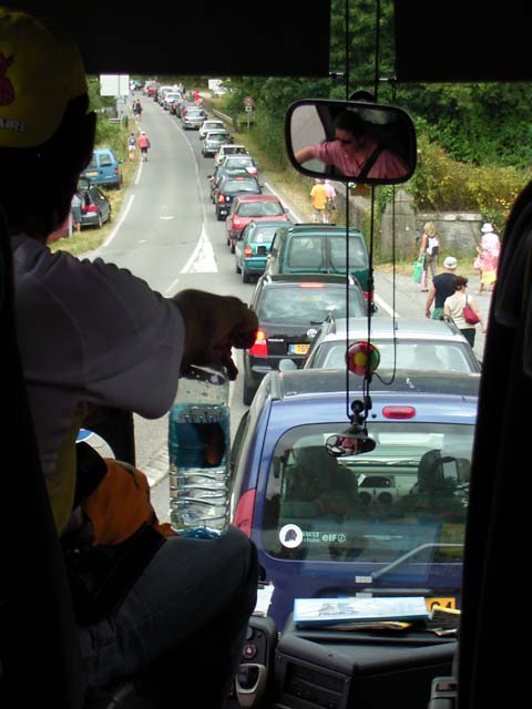 そして前方は、車の列、列、列……。ツール期間中は、フランスの至るところでこういう渋滞が発生するのでしょう。ひたすら忍耐であります |