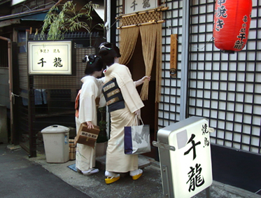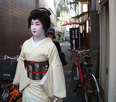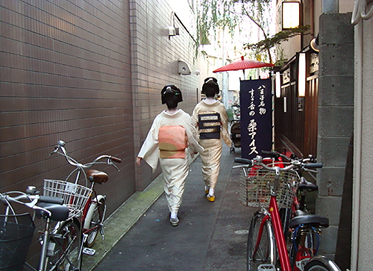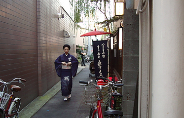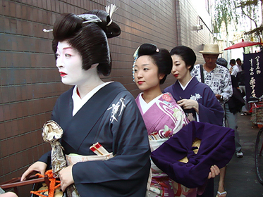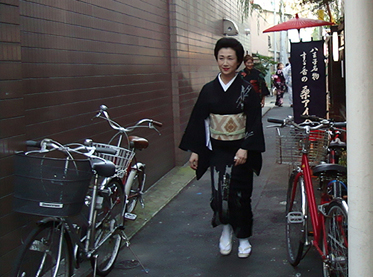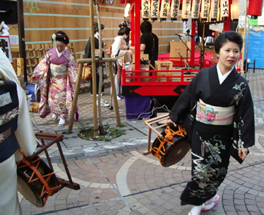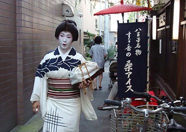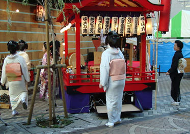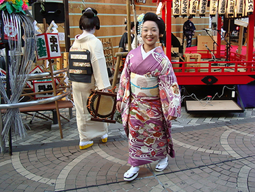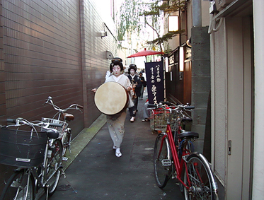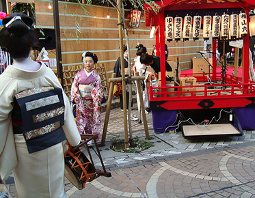 祭り初日の午後6時30分より、八王子芸妓衆による「宵宮の舞」が、中町公園の特設舞台で催された。置屋“幸乃恵”は、中町公園の目の前の路地に入ってすぐのところにある。きっと、芸者さんはこの路地を通って公園の舞台に行くだろうと推察した編集子は、路地の入口に陣取って待つこと30分。おおっ。狙い通り。